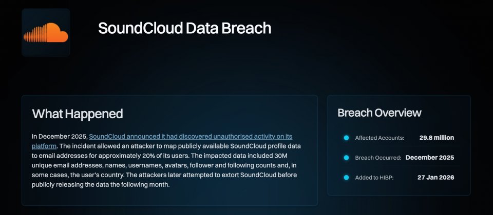 SoundCloud後台輔助儀表板遭未授權存取,HIBP指約2980萬帳戶資料外流,含約3000萬個獨立電郵地址,無密碼及財務資料。平台處置後遭DoS攻擊,攻擊者以電郵騷擾相關人士並聲稱持有敏感資料,平台已強化防護,HIBP已收錄事件,官方提醒用戶防范網絡釣魚。