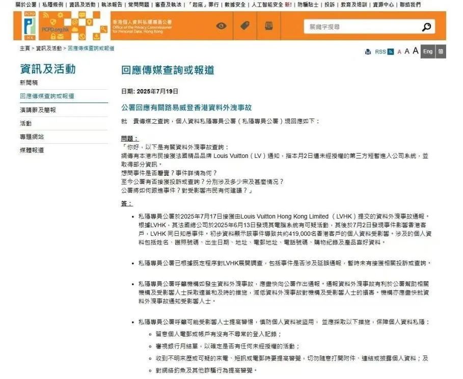 「初步資料顯示,該事件導致約41.9萬名香港客戶的個人資料受影響。」7月19日,香港個人資料隱私專員公署(以下簡稱PCPD)稱,於7月17日獲取Louis Vuitton Hong Kong Limited(以下簡稱LVHK)提交的資料外洩事故通報,涉及當地消費者的個人號碼、記錄等電話。PCPD表示,已對LV展開調查,包括LVHK是否有延誤通報等問題。
